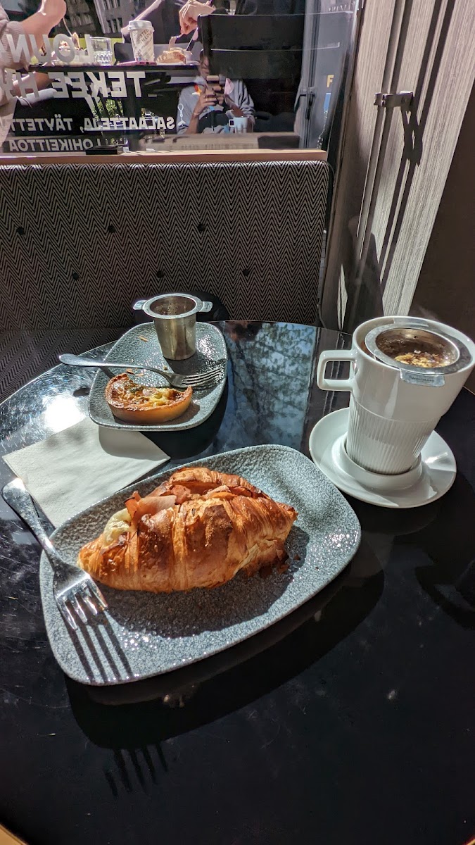 The lunch menu features standout items such as the Uuniperuna—a baked potato that comes stuffed with your choice of skagen, salmon, or mushroom filling and served with a refreshing green salad for just €10.70. For seafood enthusiasts, the Kermainen lohikeitto (creamy salmon soup) at €10.00 is a must-try, rich and comforting, served alongside freshly baked bread. The café's Lasagne, paired with a light salad, is another customer favorite, showcasing hearty flavor for only €10.70.
